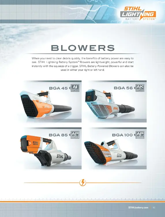 The STIHL Lightning Battery System. Within that the existing pro line is known as the AP system while the new mid-range and lighter duty tools will be released as the AK and AI systems respectively. Within the STIHL Lightning Battery System the STIHL BGA 56 blower combines STIHL performance and exceptional value. The STIHL battery product line features three tiers of performance so you can find the right family of products for your needs. With those little frustrations out of the way you can imagine the pleasant upgrade I experienced with STIHLs new line. Brian Manke STIHL marketing manager talks about the new STIHL Lightening Battery Systems family of products and the new dealership showroom display. It delivers excellent cutting performance for up to 45 minutes on a single charge and is ideal for limb removal and storm cleanup. STIHL Lightning Battery System Review. It features two attachments grass shear and shrub shear to meet specific trimming needs.